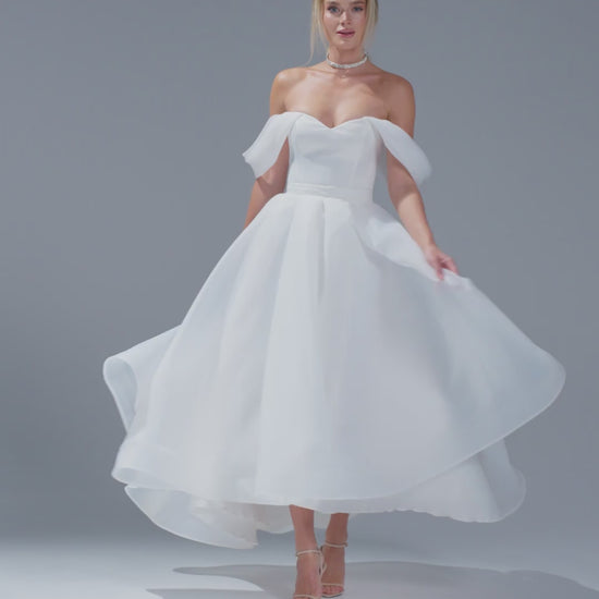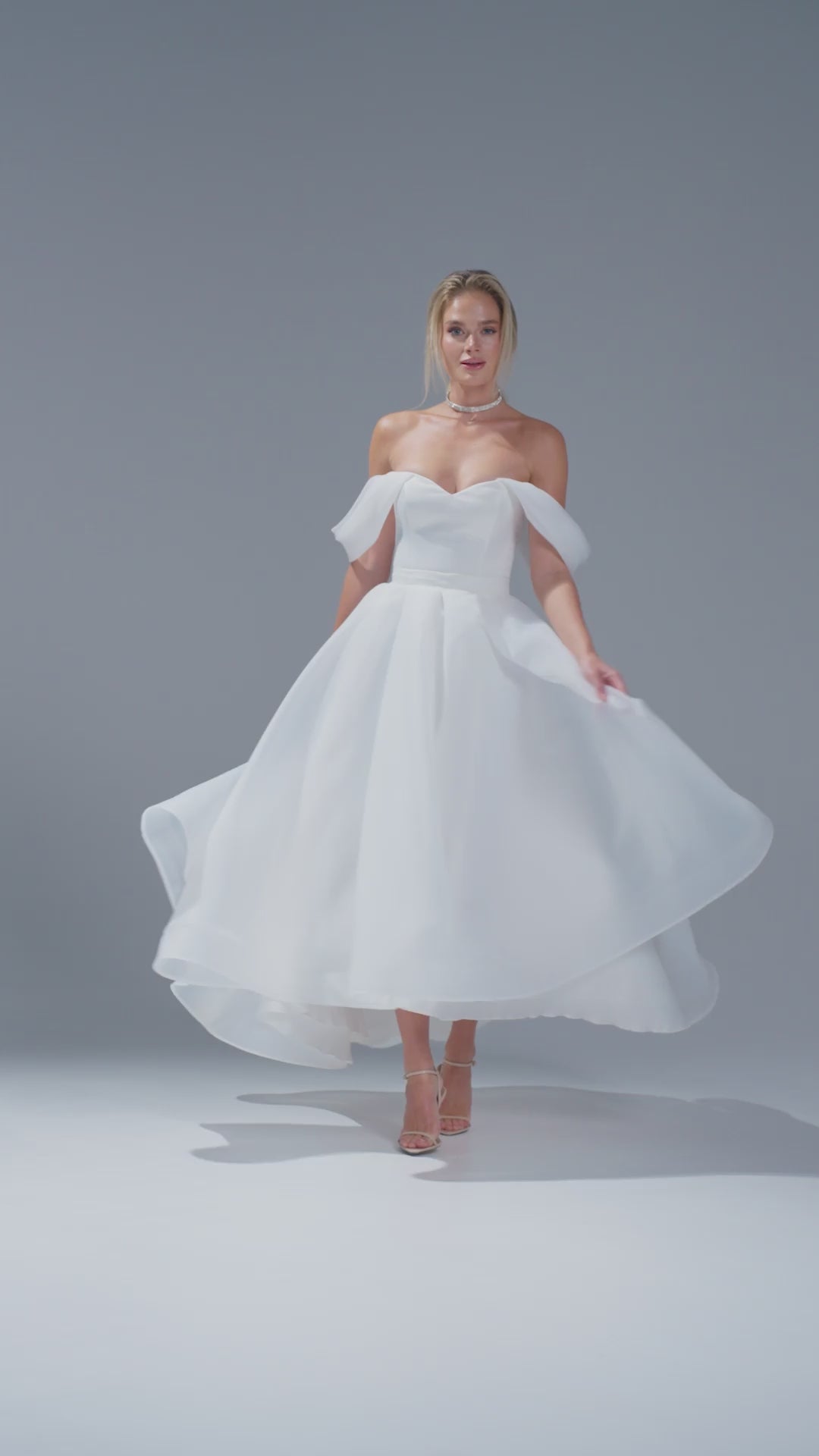 Ethereal off-the-shoulder dress in airy organza with fitted bodice and high-low skirt for a graceful modern look.